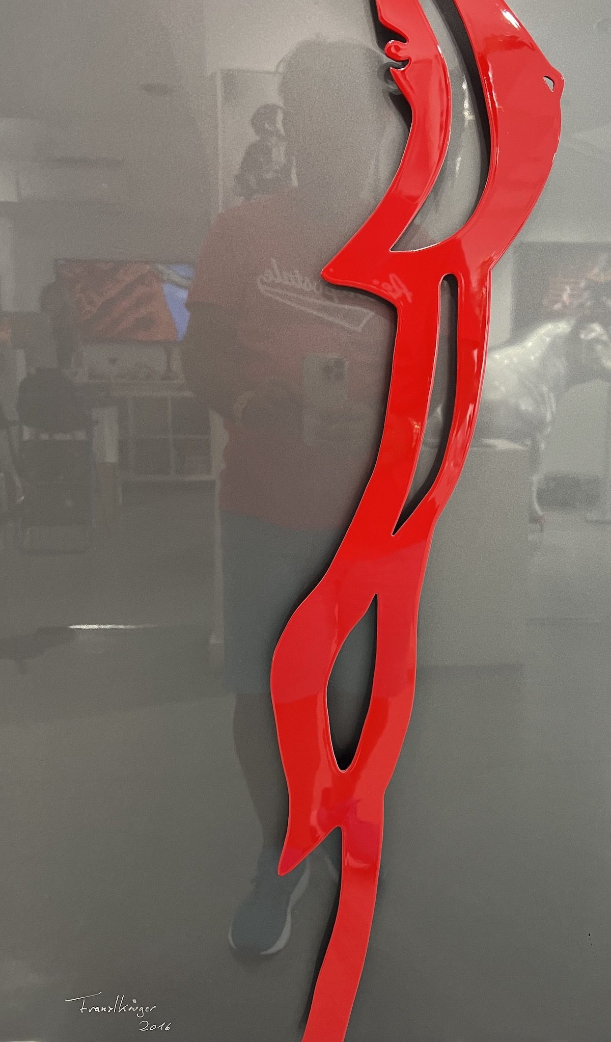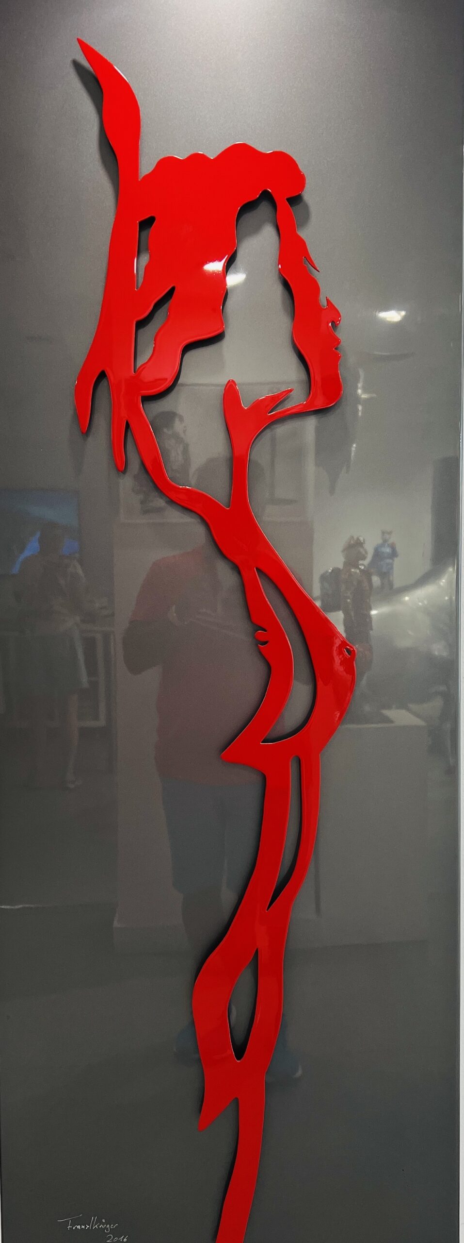 Krügers Verwendung von Aluminium als Hauptmaterial zeigt seine innovative Herangehensweise an die moderne Kunst. Die glatte, reflektierende Oberfläche des Metalls und die kräftige rote Farbe der Umrisse erzeugen eine visuelle Spannung, die den Betrachter in ihren Bann zieht. Die präzise Ausführung der Konturen und die subtile Darstellung der weiblichen Form zeugen von Krügers technischem Können und künstlerischer Sensibilität.