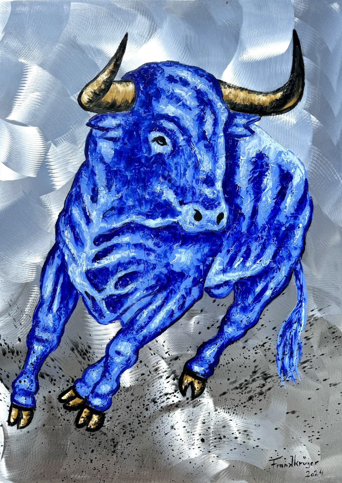 In „Stier Adrian“ zeigt sich Krügers meisterhafte Fähigkeit, die lebendige Energie und den Charakter des Tieres einzufangen. Der blaue Stier scheint fast aus dem Bild herauszutreten, seine Bewegung ist so realistisch dargestellt. Das Zusammenspiel von Licht und Schatten auf dem Aluminiumhintergrund verleiht dem Gemälde eine besondere Tiefe und Intensität.