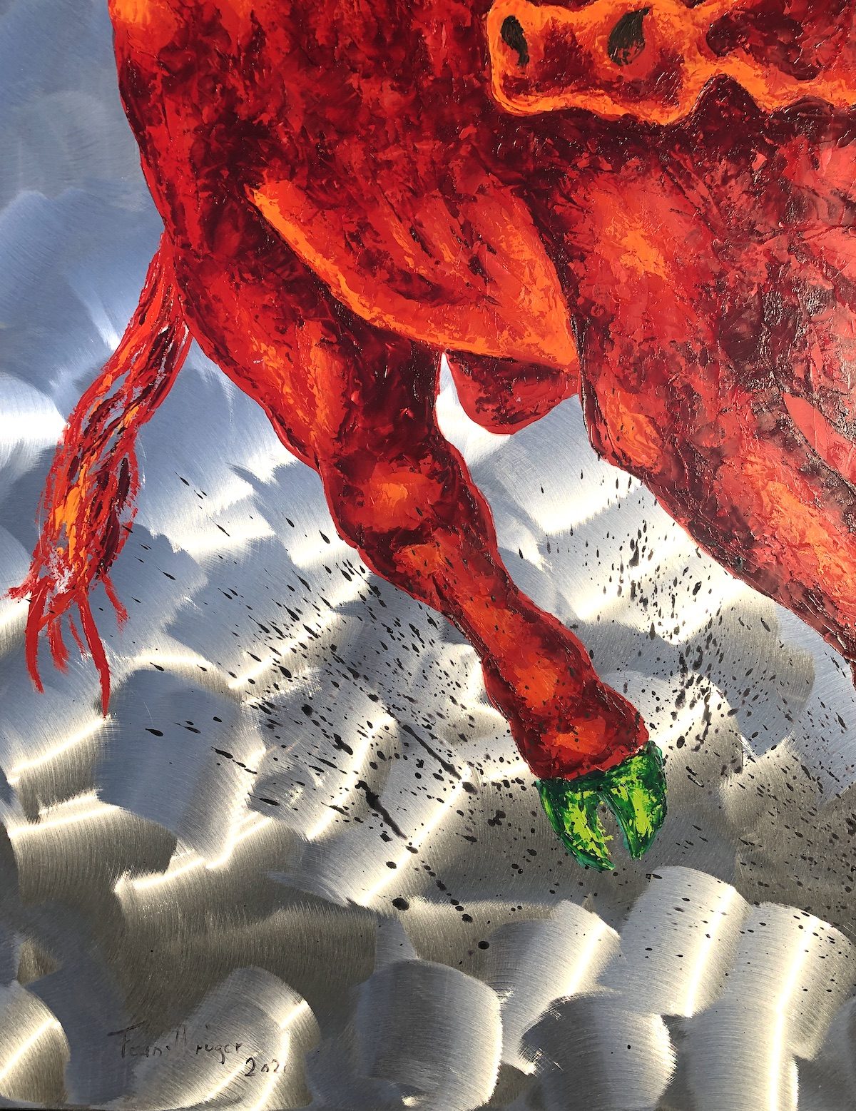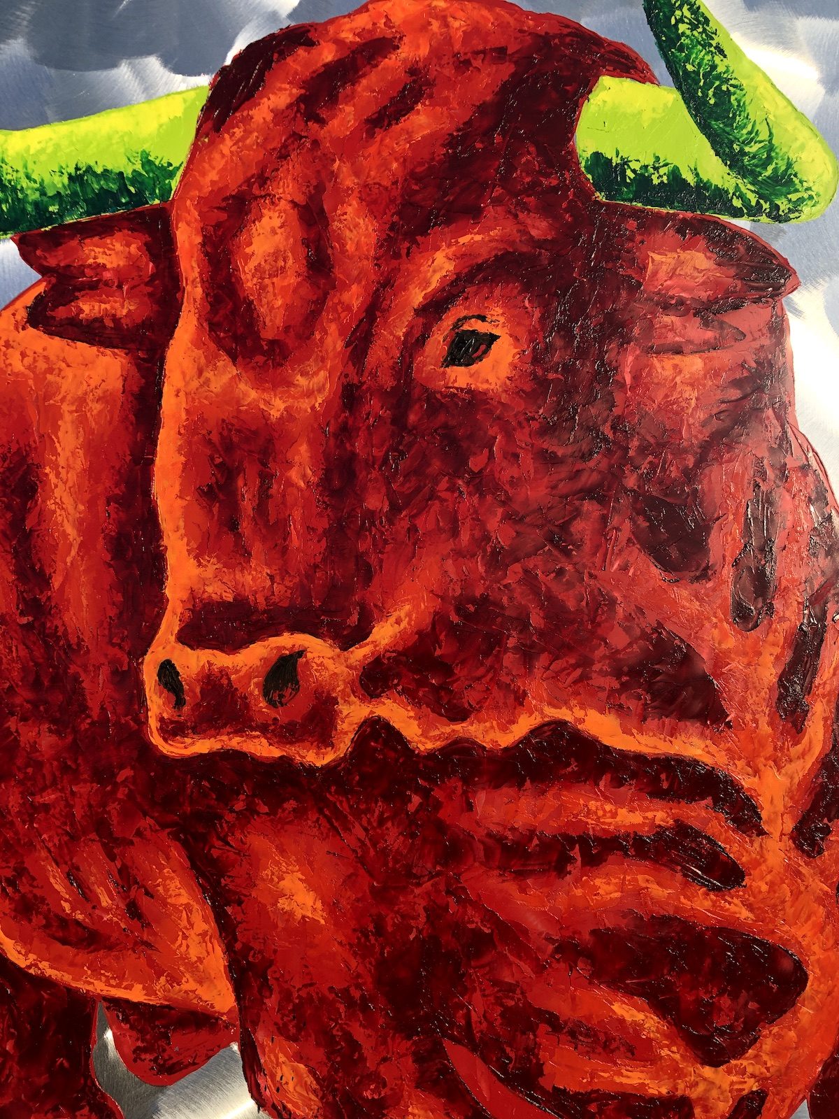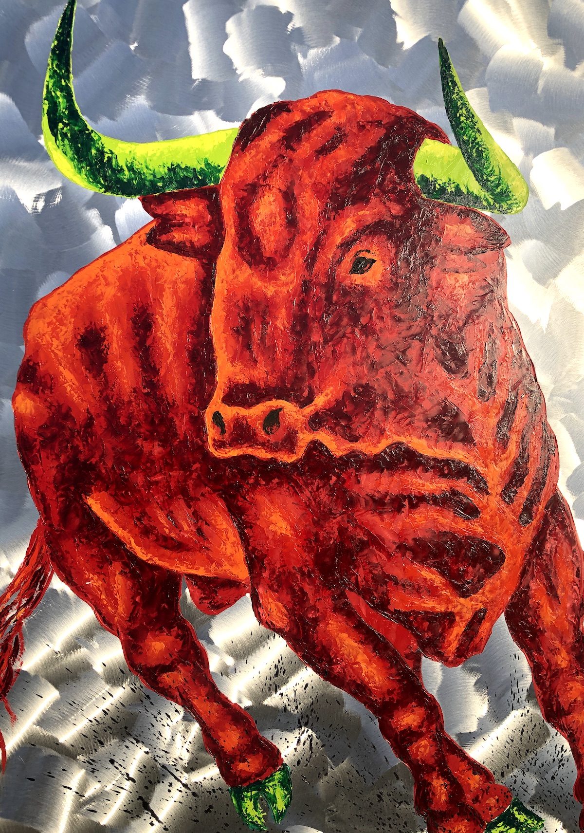 Wer sich für ein Stiergemälde von Frank Krüger entscheidet, entscheidet sich für das Außergewöhnliche! Das Bild ist in Öl auf Aluminium gemalt, und allein diese Oberfläche macht „Sein“ so besonders. Hinzu kommen die leuchtenden, ungewöhnlichen Farben und natürlich die Dynamik, die von dem Gemälde ausgeht. Ganz gleich, wo dieses Kunstwerk seinen Platz findet – es wird immer alle Blicke auf sich ziehen.