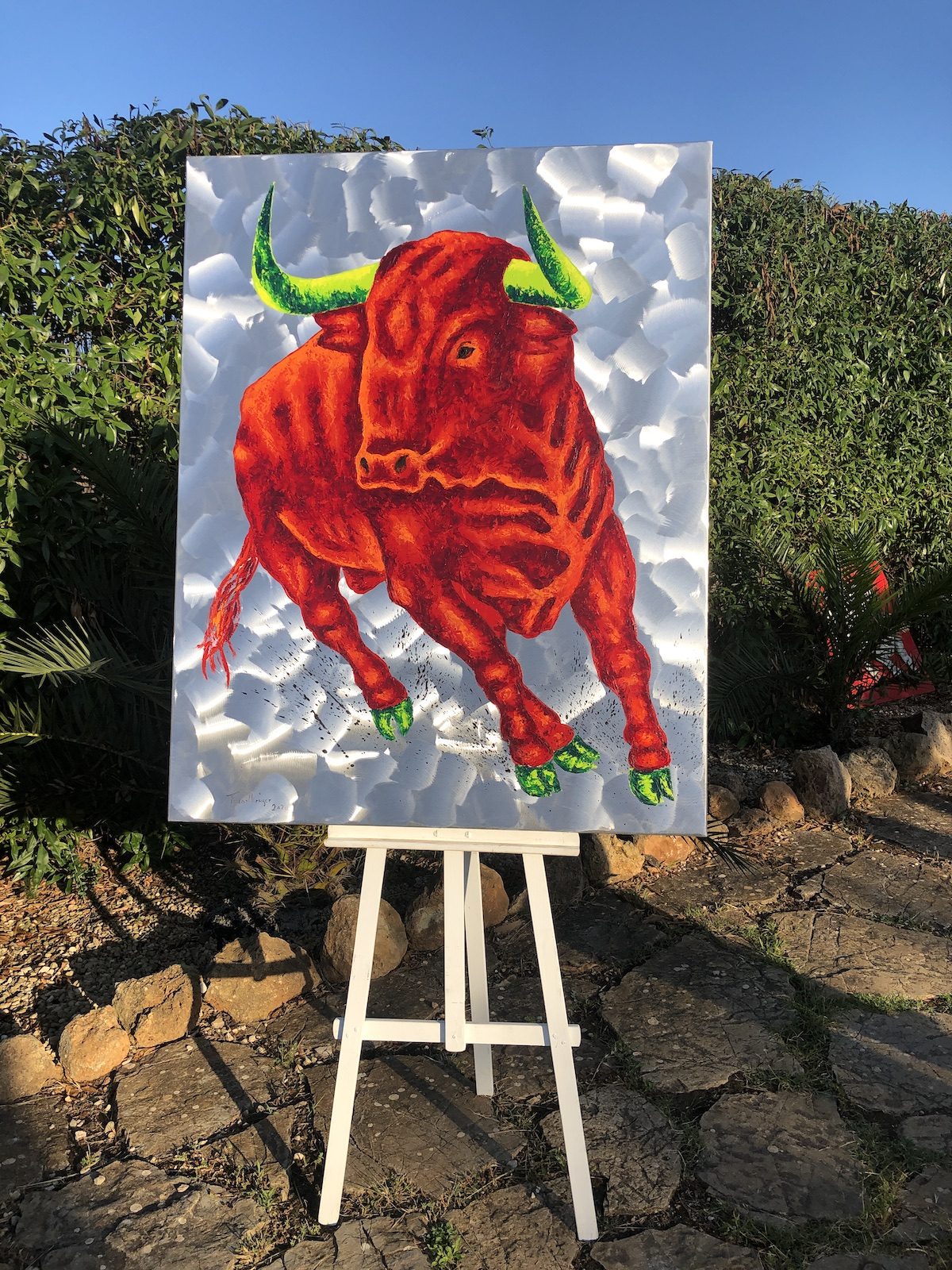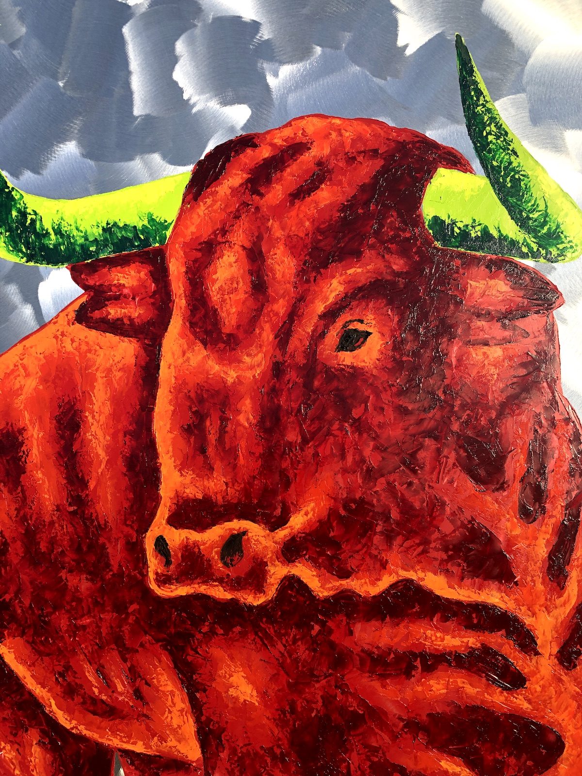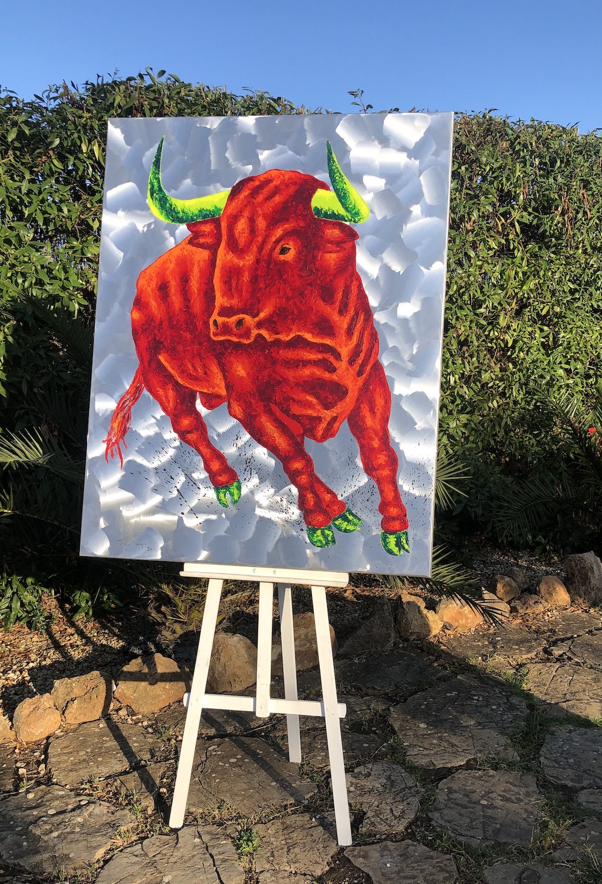 Wer sich für ein Stiergemälde von Frank Krüger entscheidet, entscheidet sich für das Außergewöhnliche! Das Bild ist in Öl auf Aluminium gemalt, und allein diese Oberfläche macht „Sein“ so besonders. Hinzu kommen die leuchtenden, ungewöhnlichen Farben und natürlich die Dynamik, die von dem Gemälde ausgeht. Ganz gleich, wo dieses Kunstwerk seinen Platz findet – es wird immer alle Blicke auf sich ziehen.